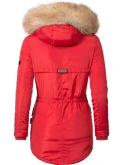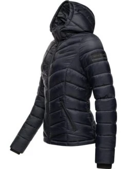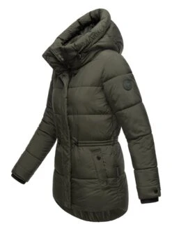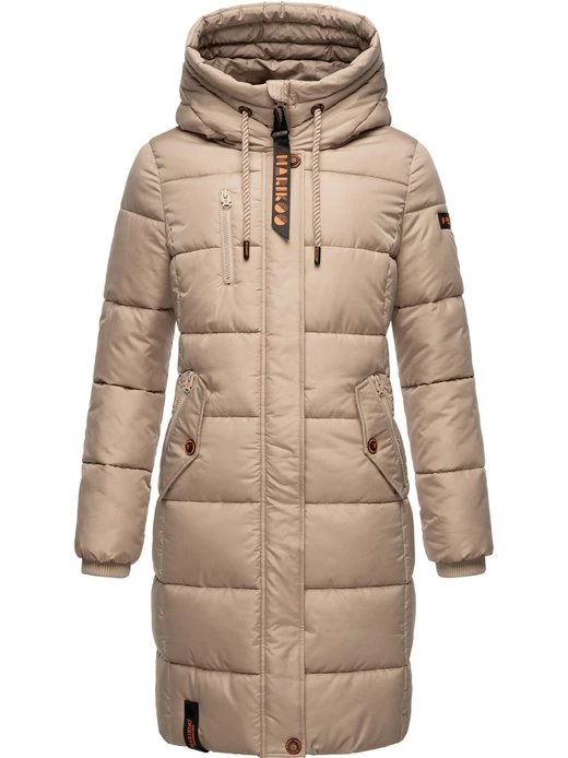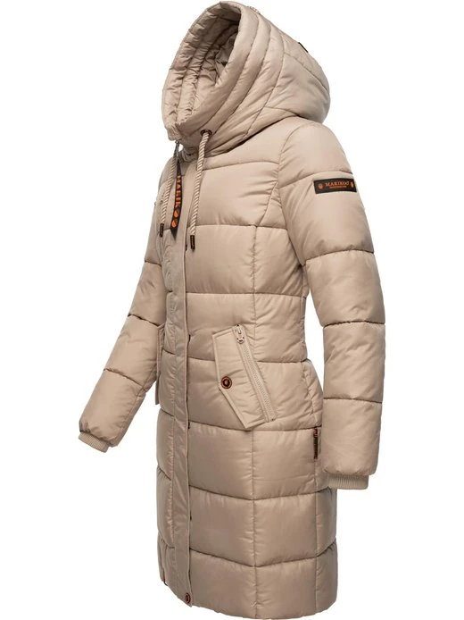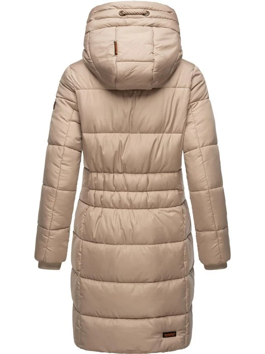 Langer Damen Steppmantel mit top Länge bis kurz über die Knie, gemütlich großer Kapuze und kontrastfarbenen Elementen von der Marke Marikoo.